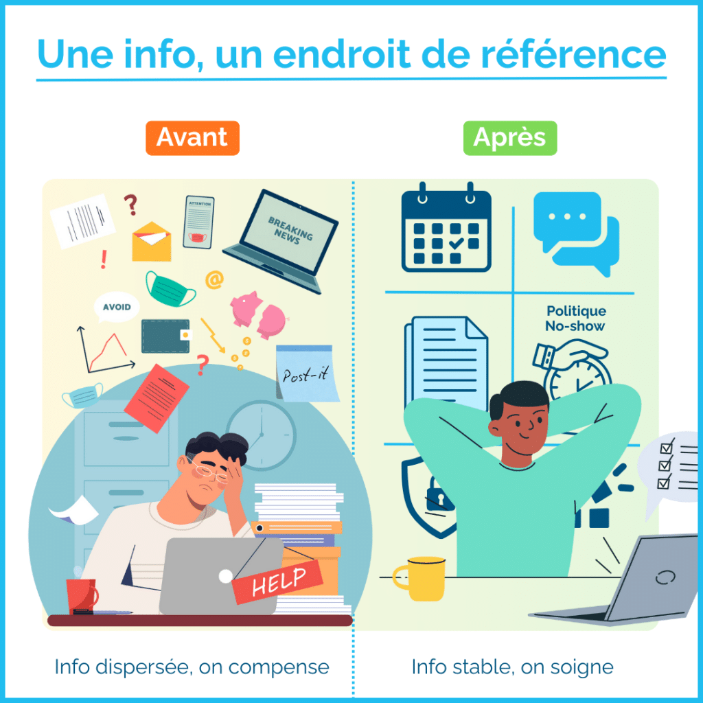 Les méthodes de management tiennent mieux quand l’information circule vite, reste au bon endroit et se retrouve facilement : planning, dossier patient, documents, tâches, suivis. Commencez par une règle simple : une donnée = un endroit de référence. Le téléphone du cabinet, une consigne post-soin, une information de prise en charge, un document signé : chaque élément doit avoir une localisation unique, évidente et accessible à l’équipe. Ce principe réduit les vérifications en chaîne et les reprises.